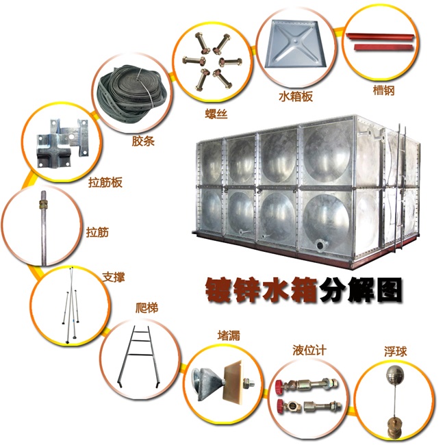 鍍鋅板水箱是按照02S101矩形給水箱圖集采用Q235鋼板制造生產(chǎn)的新型鋼板水箱,沖壓形成1000×1000和1000×500標(biāo)準(zhǔn)塊,四周鉆孔,經(jīng)熱鍍鋅處理,現(xiàn)場(chǎng)進(jìn)行安裝,組裝時(shí)標(biāo)準(zhǔn)塊之間夾無(wú)毒耐高溫橡膠墊,螺栓連接。制造、安裝均不受土建施工影響,不用焊接設(shè)備,表面采用熱鍍鋅防腐處理,美觀耐用,防止水質(zhì)二次污染,并符合建筑產(chǎn)品標(biāo)準(zhǔn)化、系列化、工廠化要求。