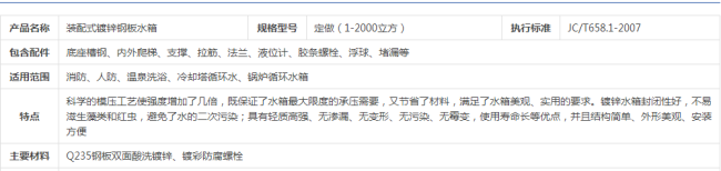5、鍍鋅板水箱該產(chǎn)品適用于建筑給水的貯存、調(diào)節(jié)水箱,采暖系統(tǒng)的膨脹、凝結(jié)水箱以及建筑施工、地質(zhì)勘察、工業(yè)、國(guó)防工程等臨時(shí)貯水水箱。